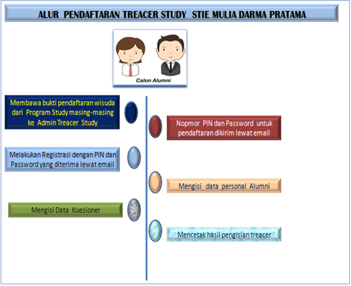 Melalui Pusat Pengembangan Karakter dan Karir STIE Mulia Darma Pratama, STIE Mulia Darma Pratama saat ini sedang melaksanakan riset karir alumni STIE Mulia Darma Pratama melalui studi penelusuran alumni (tracer study). Kegiatan ini bertujuan untuk mengetahui perkembangan karir alumni dan mendapatkan masukan bagi perbaikan dan penyempurnaan sistem pendidikan di STIE Mulia Darma Pratama. Kami menghimbau partisipasi dan kerjasama alumni dalam melakukan pengisian e-kuisioner Tracer Study yang dimuat di web treacer_stie .muliadarmapratama.ac.id. Informasi yang diperoleh dari isian kuisioner tersebut dapat kami manfaatkan untuk perbaikan sistem pendidikan di STIE Mulia Darma Pratama. Survey ini juga menggali informasi terkait proses kondisi pembelajaran di STIE Mulia Darma Pratama yang akan digunakan sebagai umpan balik (feed back) bagi penyempurnaan kurikulum di setiap program studi.